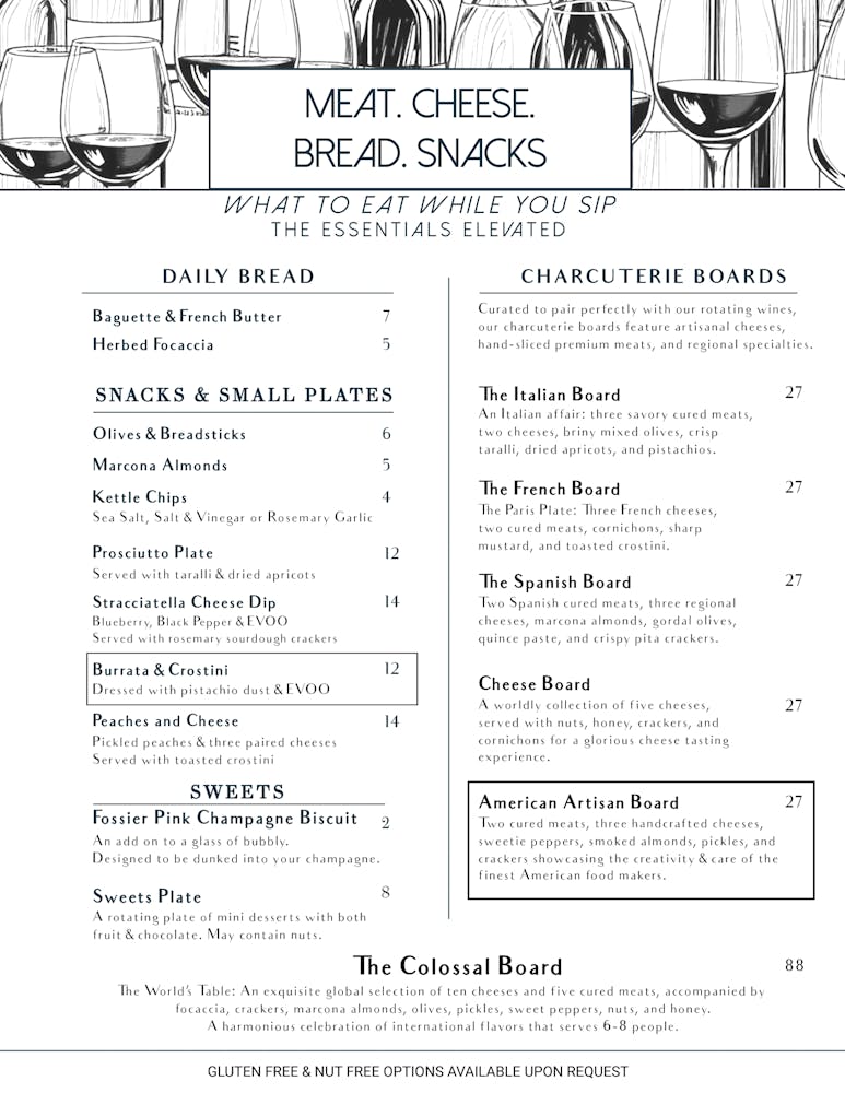 Our menu is crafted for indulgence—whether you're curating a meal from our crave-worthy snacks, savoring one of our signature boards, or sharing a little of everything with friends.