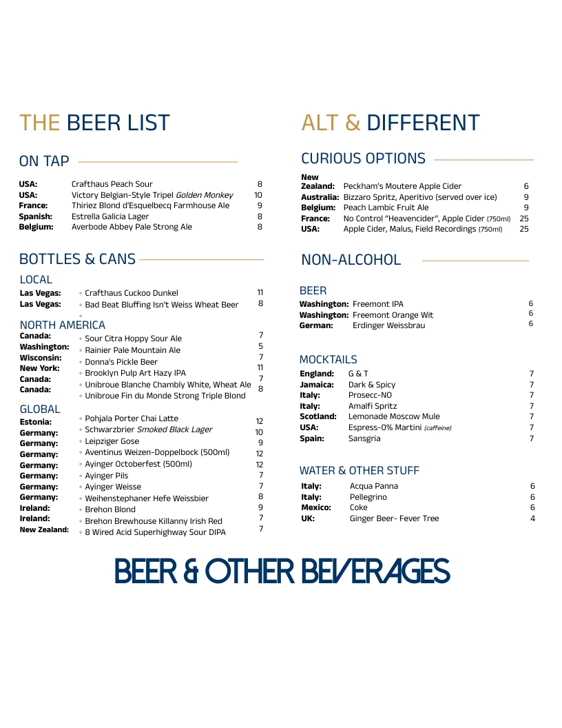 We like to keep things fresh and fun, so our wine list changes regularly. You can always expect a mix of reds and whites, a few fabulous rosés, more than a few bubbly options, unique and intriguing orange wines, and of course, some natural wines. For the adventurous, we have unexpected gems to tickle your taste buds, along with those trusty classics that never go out of style. Plus, our wines come from both domestic and global regions, offering you a world of flavors to explore.