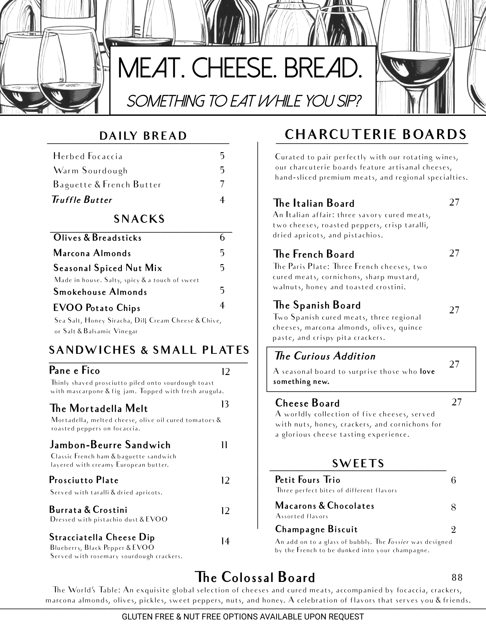 Welcome to a fun-filled adventure for your taste buds! Whether you're a seasoned wine lover or just starting your journey, we've got something to make you smile. Our wines by the glass are split between classic favorites and curious surprises, so there's always something exciting to try.